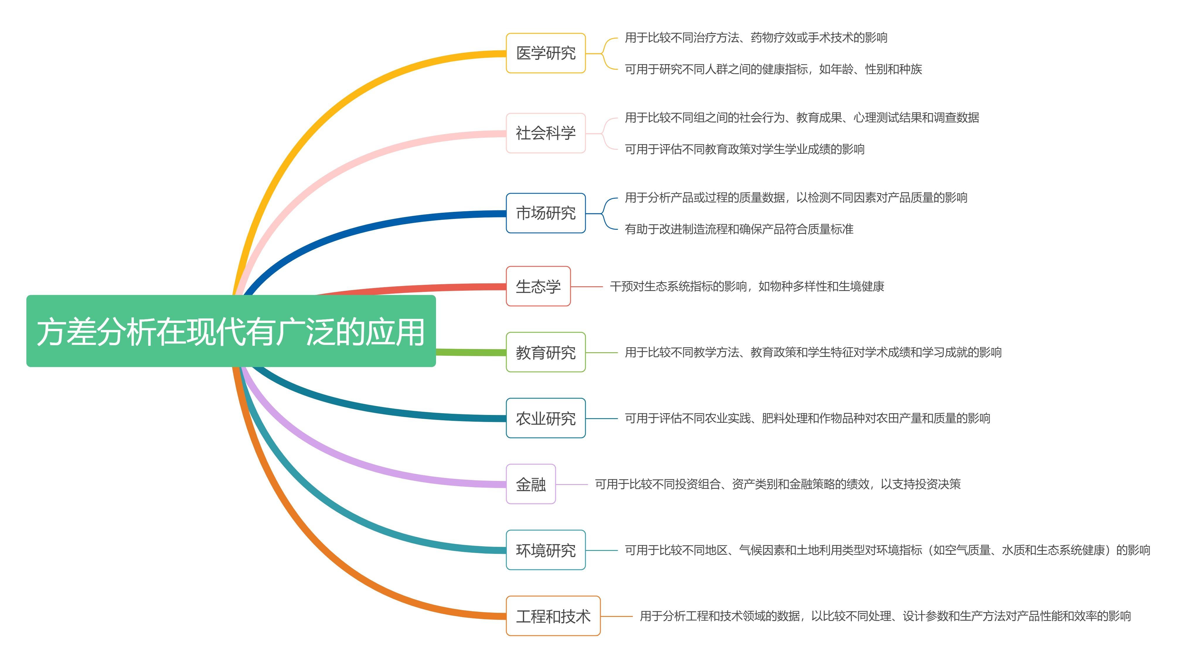 方差分析在环境研究中有多种具体应用,帮助科学家和研究人员分析和比较不同环境因素对生态系统、环境质量和自然资源的影响。生态系统研究/土壤质量分析/水质研究/空气质量分析/野生动植物生态学/气候研究/环境政策评估/自然资源管理/环境毒理学/生态修复研究。